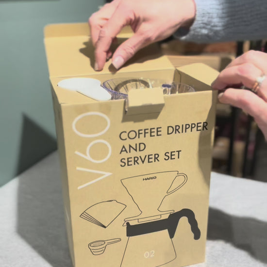 Hario V60 Startersett. Opplev den fantastiske smaken av håndbrygget kaffe med Hario V60 startsett. Dette komplette settet inneholder alt du trenger for å lage en deilig kopp pour over-kaffe hjemme eller på jobb.